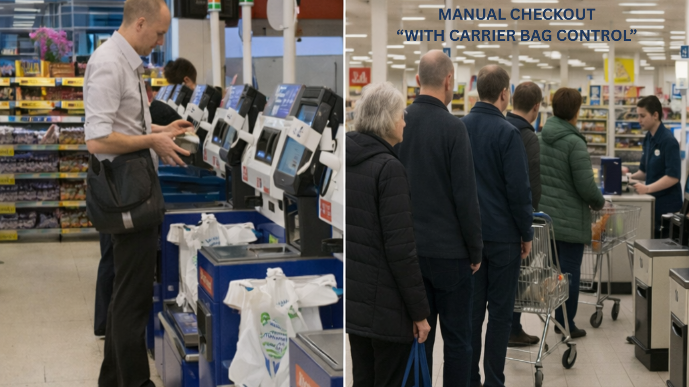 When reusable bags are left within easy reach of customers, many fail to scan them — whether through error or intent — resulting in unrecorded stock losses. Conversely, when managers restrict bag access to reduce theft, customers requiring a bag must queue at a staffed checkout, undermining the efficiency gains of self-service systems.